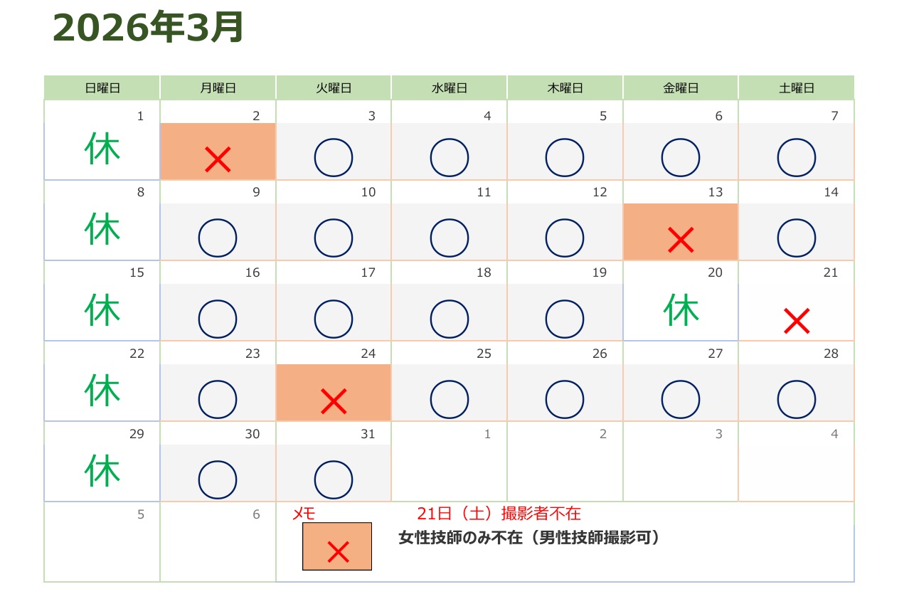 2026年3月のマンモグラフィ撮影の女性技師不在日はこちらです↓↓
