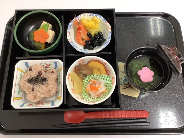 1/1の昼食におせち料理をご用意しましたので、ご紹介させていただきます。手前より、赤飯、若鶏八幡巻、伊達巻、数の子、紅白なます、炊き合わせ、さつま芋きんとん、黒豆、有頭えび、以上9品をお重に詰めました。蓋を開けると「ごちそうや~」と歓声が上がり、皆さん笑顔で召し上がられていました。
