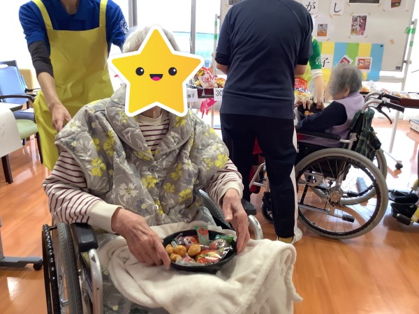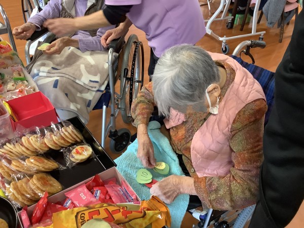 今回は、買い物へ行くという設定で利用者様にはみんなで作った紙のお金300円分を持っていただきました。せんべい、和菓子、ドーナツ、ビスコ、粟おこし、ポテトチップスなどスーパーで見かけた事のある商品をズラッと並べ、順にお店に立ち寄っていただきました。