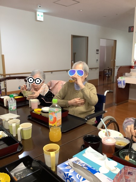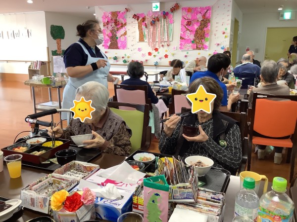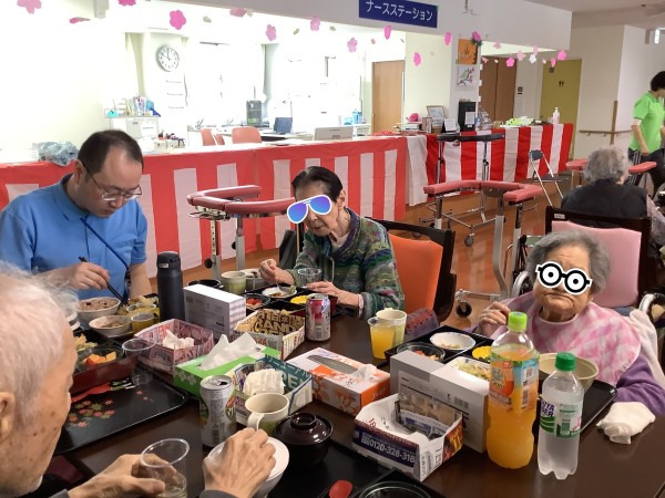 フロアの壁面に入所者様が作成した桜をたくさん飾り、華やかな空間の中、御赤飯、天ぷら、煮物、フルーツが入った豪華なお弁当にノンアルコールのビールと梅酒、サイダー、オレンジジュースを用意しました。御膳を配ると蓋とそっと覗いている方や「これは高いんちゃう!?」と驚いている方、「ビールええな」と嬉しそうにしている方など様々な表情が伺えました。また、この日はテーブルをくっつけて、職員も一緒にお食事を楽しみ、いつもと違う賑やかな昼食を過ごしました。