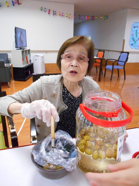 梅シロップを作りました。女性のご利用者様は「懐かしいわ~」「もう作り方忘れてしもたわ」等と言いながら、テーブルに青梅が並ぶと黙々と手際よく丁寧にヘタを取り除いておられました。梅シロップを瓶に詰め氷砂糖が溶けるように毎日大きな瓶を転がしながら「上手いこと出来てるわ、次はらっきょ漬ける」と生き生きした表情で今まで漬けてきた漬物の作り方などを教えて下さいました。「梅干しの 取り出し懐かし よみがえる」と短歌を詠むご利用者様もおられました。