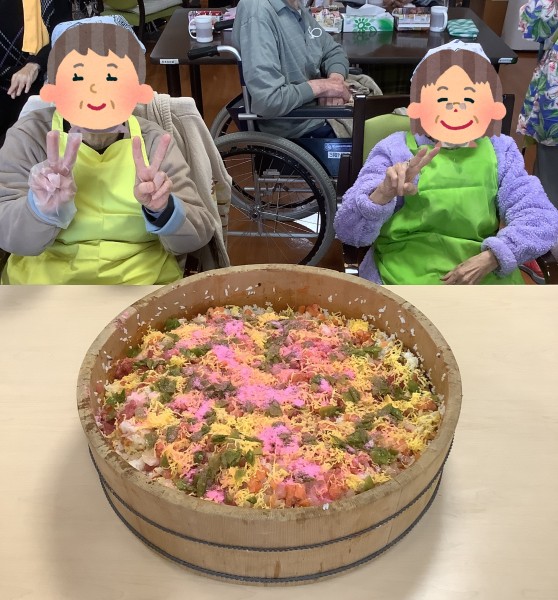 3月19日にちらし寿司を利用者様と協力して作りました!普段でも月に1回ちらし寿司を提供することはあるのですが、3月はひなまつりということもあり、なんと特別にお刺身付きです!!お刺身はマグロ、鯛、サーモンの3種類で、他は一般的なちらしの具材をご用意させていただきました。酢飯作りから始まり、酢加減もみんなで決め、具材混ぜ、盛り付けまでたくさんのベテランお母様方に手伝っていただき、とても綺麗で美味しいちらし寿司ができたのではないかと思います。以前から「お刺身食べたいな~」という声がたくさんあり、皆様、大変喜ばれていました。