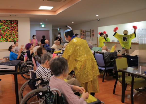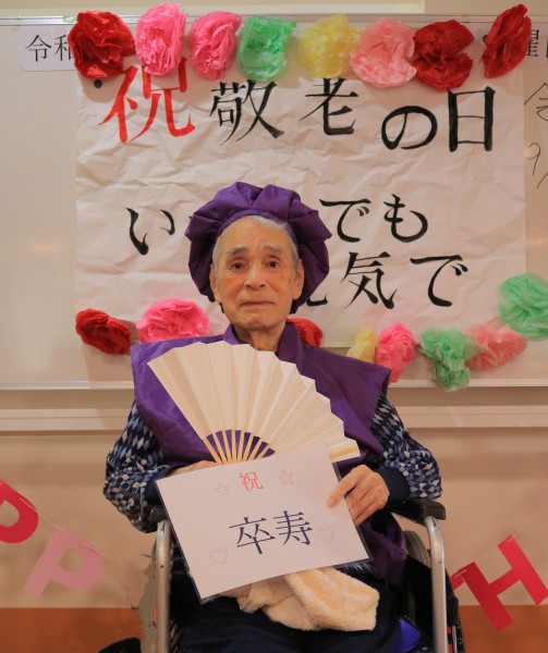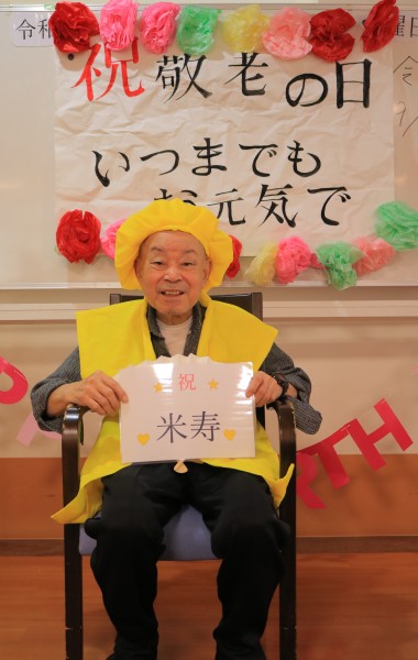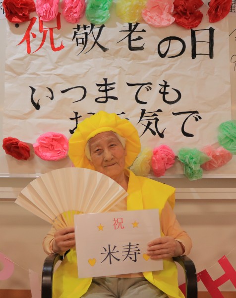 今年も例年通りに敬老会を開催しました。蒼の里では古希、喜寿、傘寿、米寿、卒寿、白寿、百寿にちなんだ黄色、紫、白の「ちゃんちゃんこ」を身にまとって頂き皆様でお祝い行事を行っております。昼食はお赤飯と天ぷらでしたが、やはり皆様お赤飯には思い入れがあるようで「お祝いの時によく炊いたわ」等の声が上がっておりました。おやつには秋らしくモンブランケーキセットが提供され、職員も楽しんで企画した「マツケンサンバ」の踊りで盛り上がり楽しいひと時となりました。これからも健やかで明るく過ごせますように職員一同願っております。